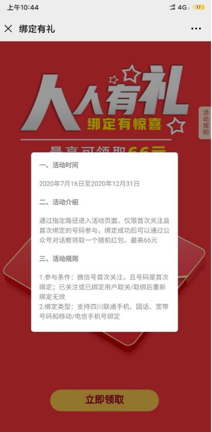 “四川联通 ”微信公众号绑定领红包现金 ,全国各地可参加 发表于 2020-08-06 分类于 活动线报 热度: 本文字数: 186 阅读时长 ≈ 1 分钟 关注公众号“四川联通”微信公众号,进去后 下面菜单栏“宠粉福利”-“绑定有礼” 点一下立即领取,能够免费领取现金红包 按照界面详细说明,应该是特别关注之后,要先绑定手机号码才行。 四川联通的手机固话宽带,和全国各地移动联通电信手机,应该是都能绑定免费领取~ 限定微信第一次特别关注,与此同时手机号码第一次绑定,才可以领 大伙儿能够薅起来啦~~ (之前绑定过的老用户,残念中。。。。。。) 关注公众号“四川联通”微信公众号,进去后 下面菜单栏“宠粉福利”-“绑定有礼” 点一下立即领取,能够免费领取现金红包 按照界面详细说明,应该是特别关注之后,要先绑定手机号码才行。 四川联通的手机固话宽带,和全国各地移动联通电信手机,应该是都能绑定免费领取~限定微信第一次特别关注,与此同时手机号码第一次绑定,才可以领大伙儿能够薅起来啦~~ (之前绑定过的老用户,残念中。。。。。。) 本文作者: JOIN 本文链接: https://freecn8.cn/p/e4309537.html 版权声明: 本博客所有文章除特别声明外,均采用 BY-NC-SA 许可协议。转载请注明出处! 欢迎关注我的其它发布渠道 RSS